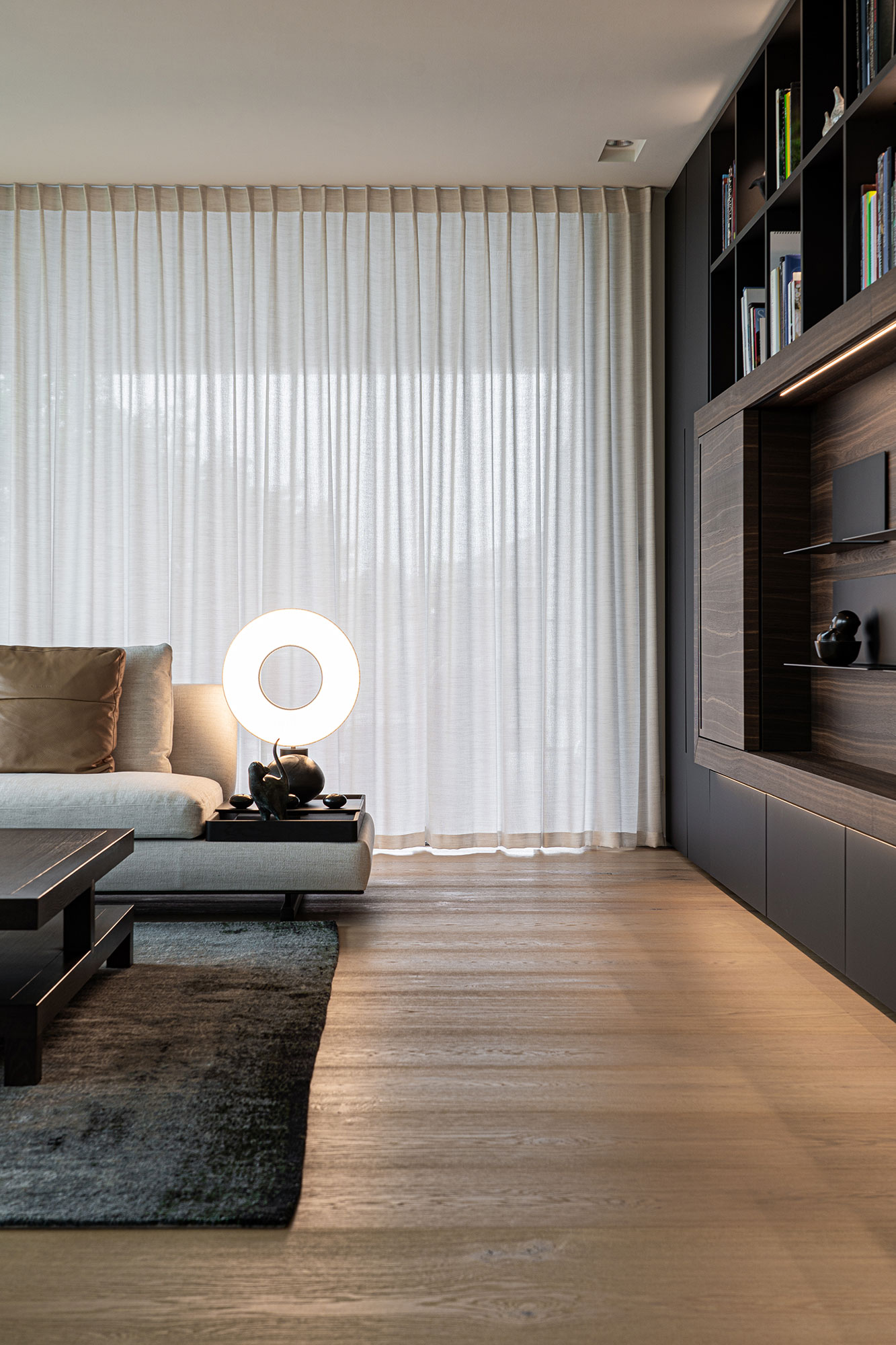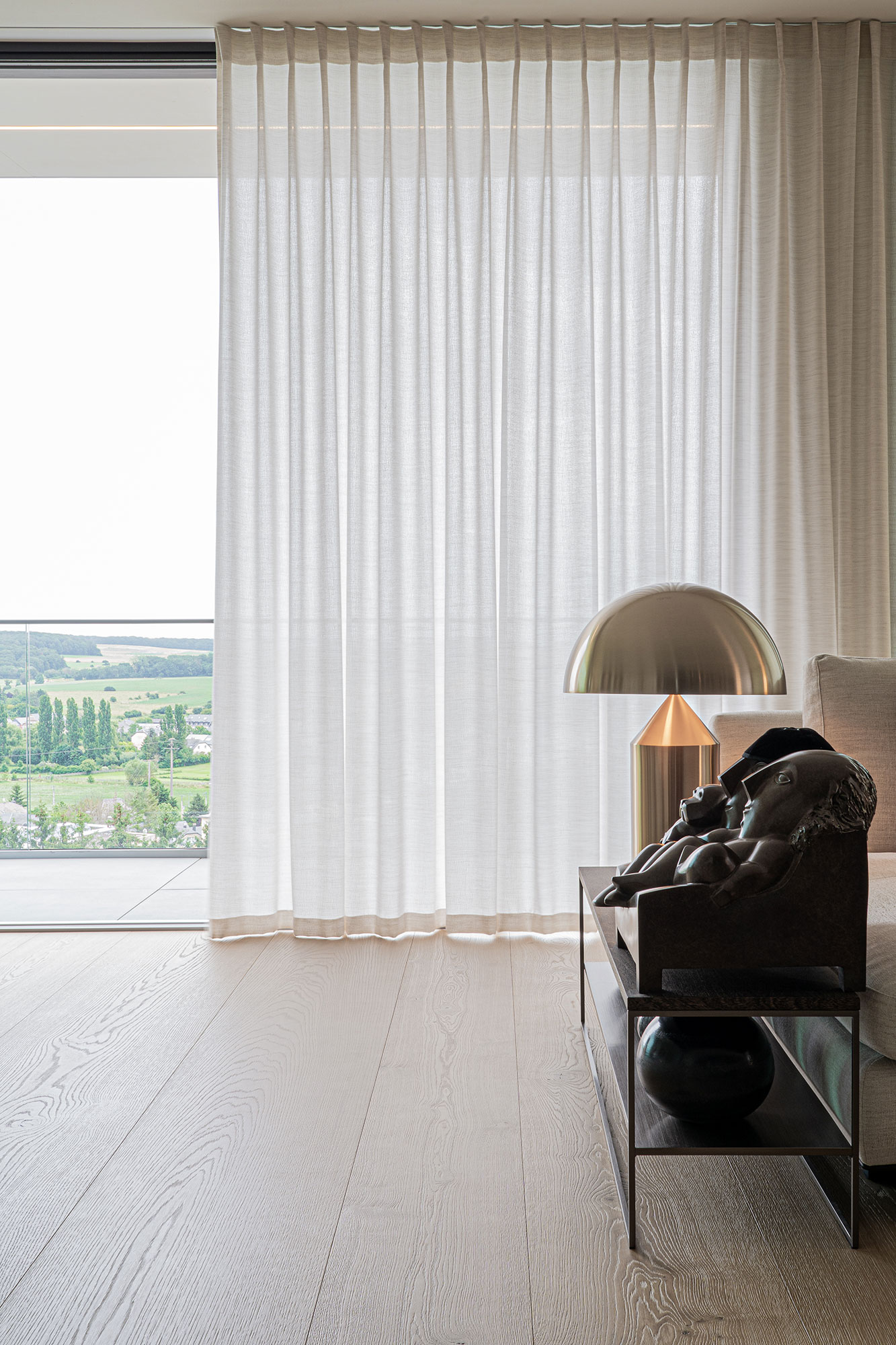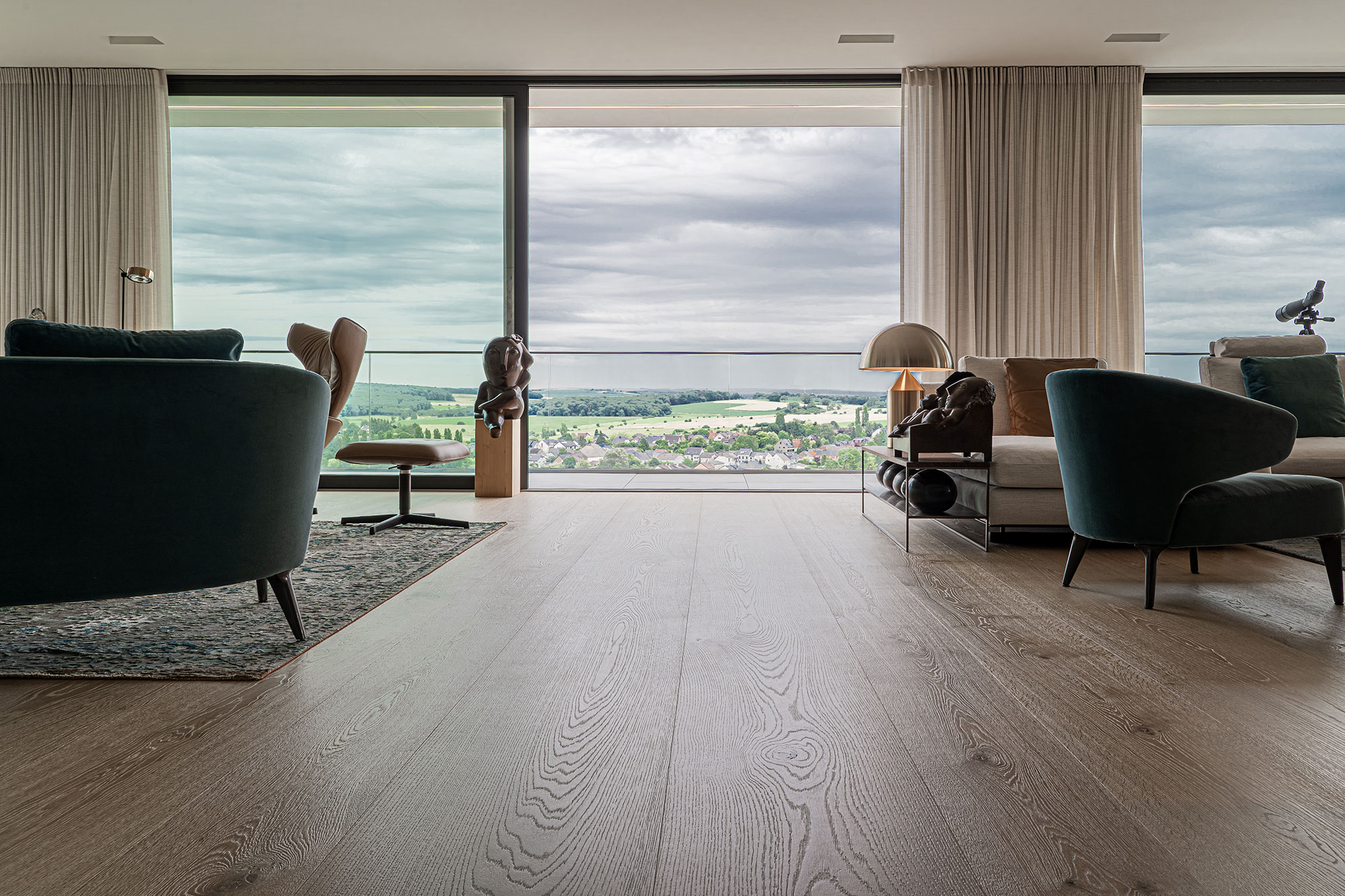 A penthouse featuring large windows, abundant natural light, engineered wood flooring and luxurious furnishings.